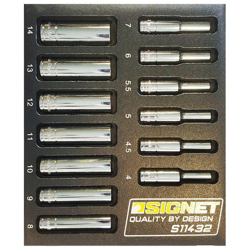 View full detailsSignet 1/4" Drive. 6 Point. Deep Sockets. 4-14mm Set. 13 Piece Set in EVA Foam S11432